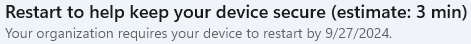 When your computer asks to be restarted, you should restart when it is convenient for you. By default, your computer updates are configured to wait 7 days from when they are first released to when your computer will automatically restart to install them. If you want to know the date your computer will automatically restart, you can go into Settings > Windows update. The restart date will be listed there.